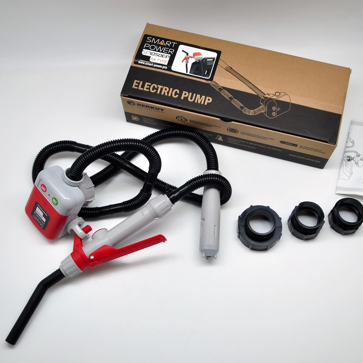 Насос электрический Berkut Smart Power SP-1050EP - для перекачки топлива, работа от батареек AA, производительность - 9 л/мин., 3 резьбовых адаптера для канистр, автовыключение