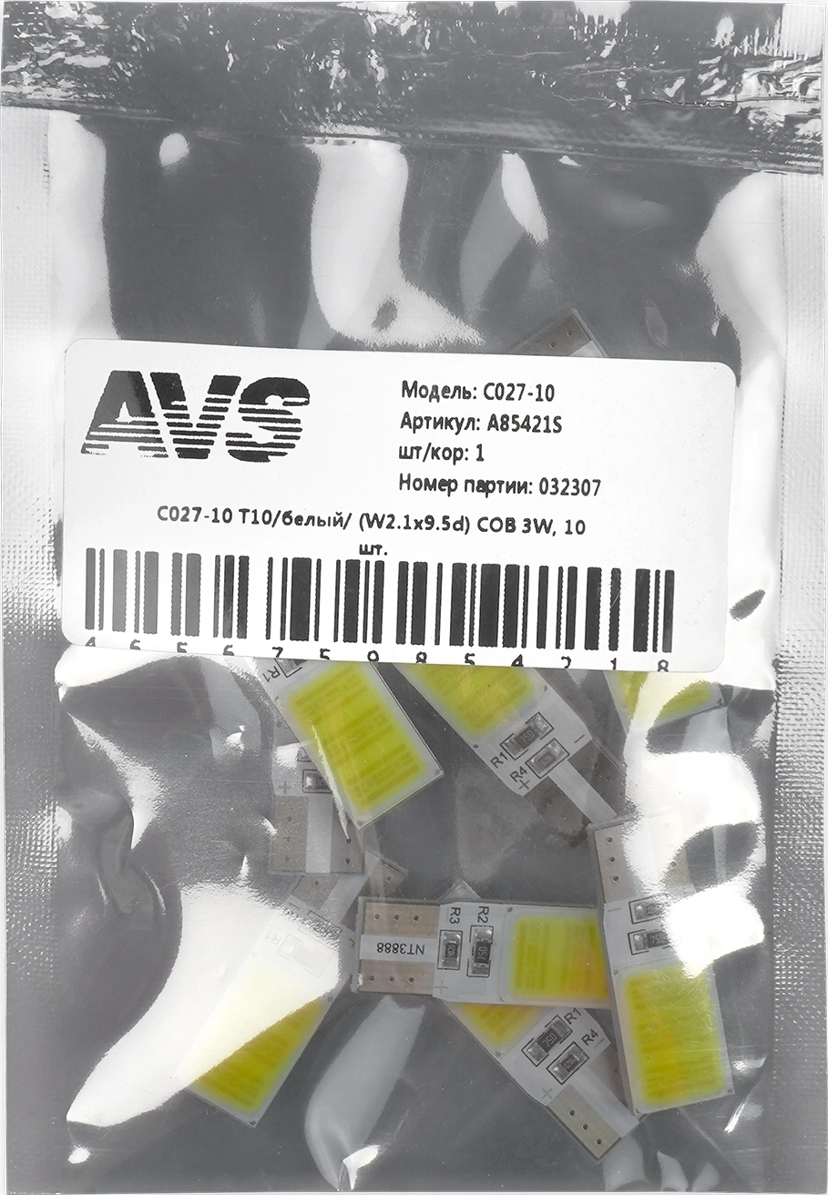Комплект светодиодных ламп AVS T10 C027-10 (A85421S) 10 шт. W2.1x9.5d, COB 3W, белый арт. 92140