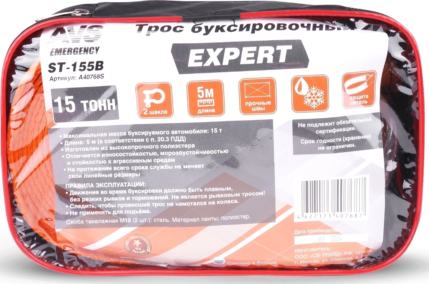 Трос буксировочный с крюками AVS EXPERT ST-155B - усиленный, максимальная масса буксируемого автомобиля 15 т, длина 5 метров