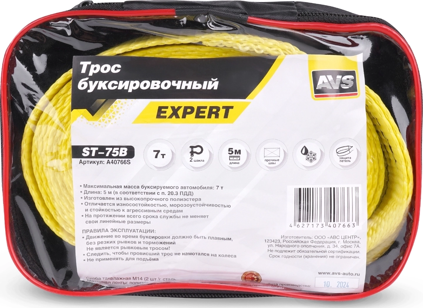 Трос буксировочный с крюками AVS EXPERT ST-75B - усиленный, максимальная масса буксируемого автомобиля 7 т, длина 5 метров