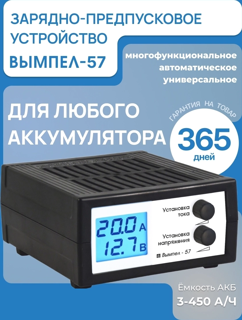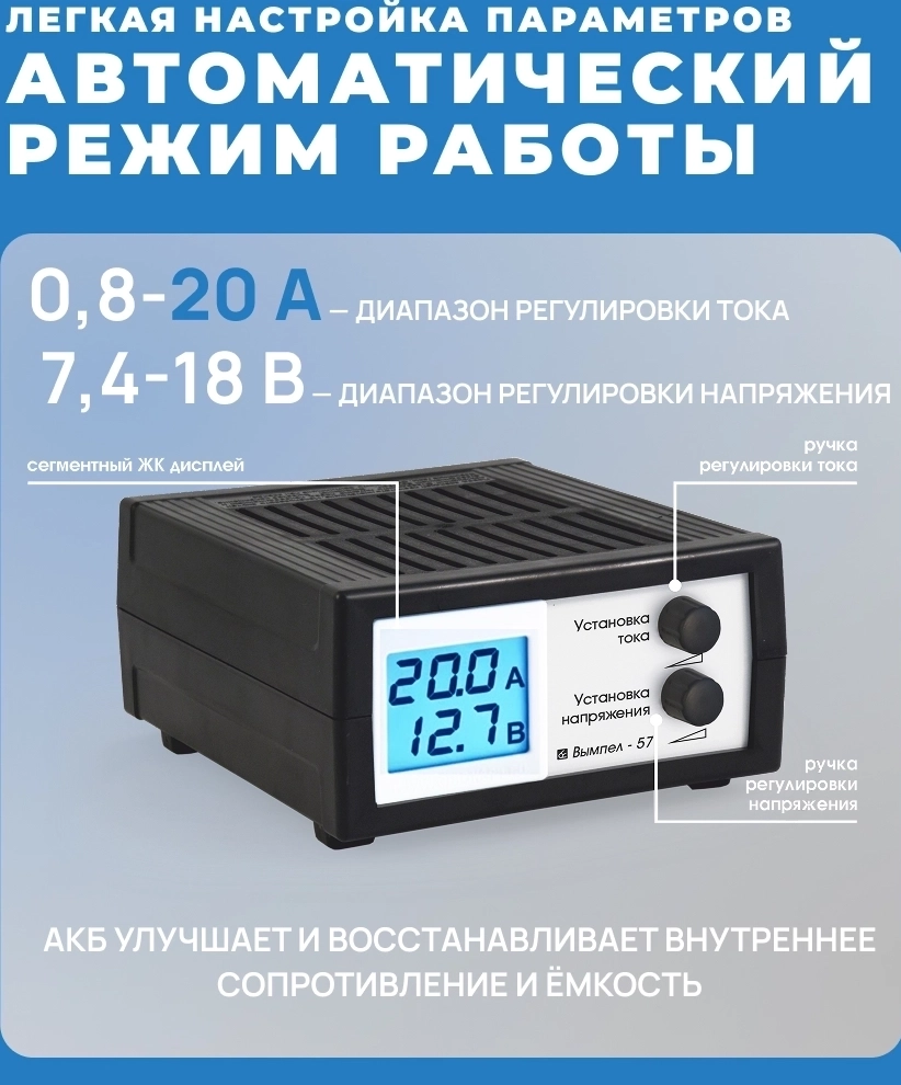 Зарядно-предпусковое устройство Вымпел 57 - ЖК-дисплей, регулировка тока, максимальный ток заряда 20 Ампер, максимальный порог напряжения 18В, ручная регулировка тока и напряжения, ЖК-экран, универсальное применение