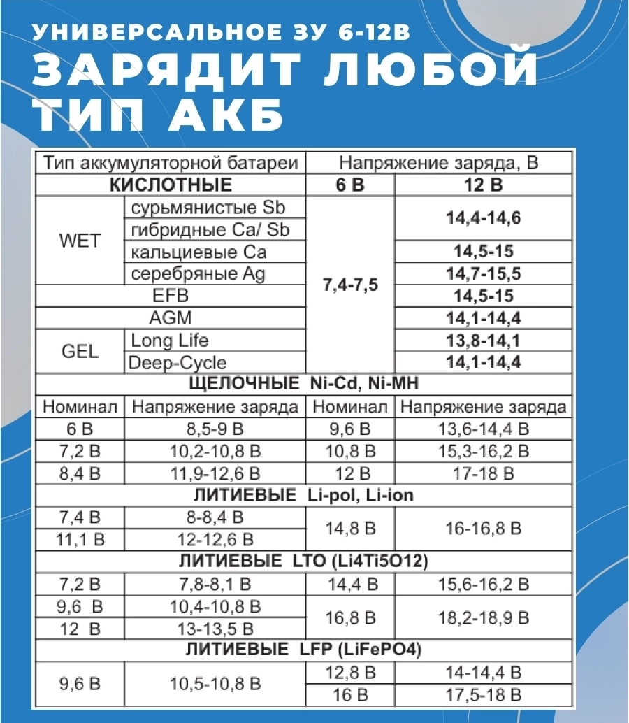 В приборе есть возможность самому выбрать максимальный порог тока до 20 А, а также напряжения до 18В. Такой широкий диапазон выходных характеристик позволяет производить заряд и восстановление практически любых аккумуляторных батарей: